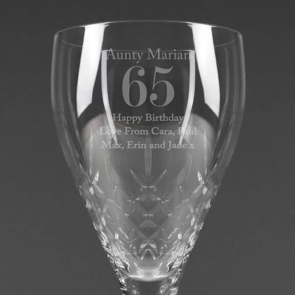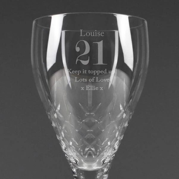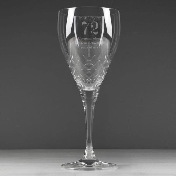 The Personalised Big Age Cut Crystal Wine Glass is a stunning gift for wine lovers celebrating a big birthday. Personalise it with a message and an age/number to create a unique and elegant gift, ideal for birthdays.