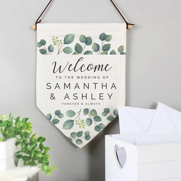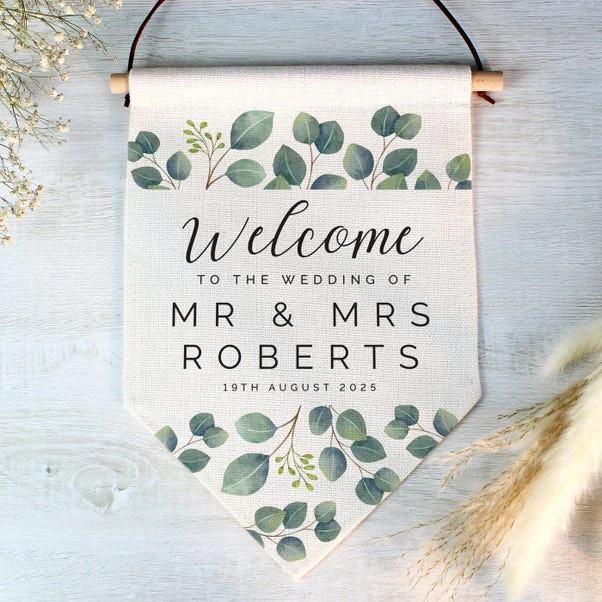 Elevate any wedding decor with this personalised botanical hanging banner. With space for customised text and a fixed ‘Welcome to the Wedding of’ message, it’s a thoughtful addition to the newlyweds’ special day, ready to hang and create lasting memories.