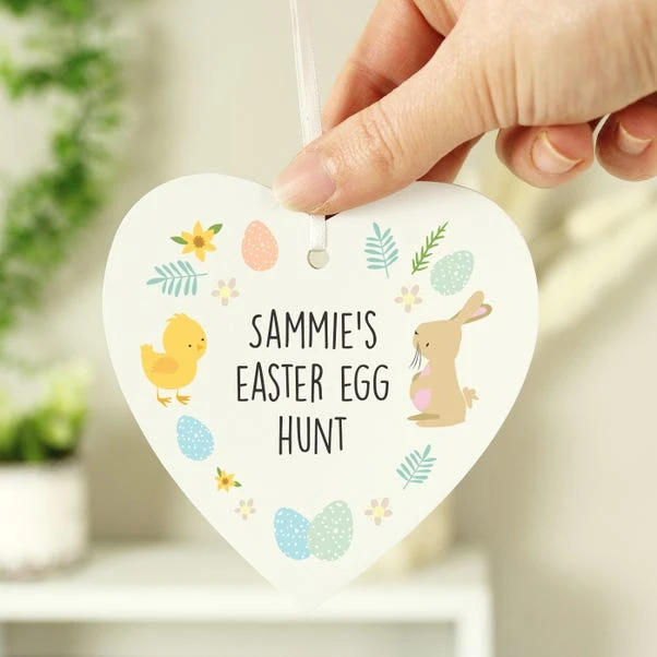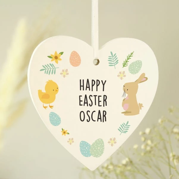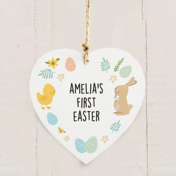 The Personalised First Easter Heart Hanging Decoration is a charming keepsake for Easter festivities. With up to 3 lines of personalisation in fixed uppercase, it adds a special touch to your celebrations. Made from wood and accompanied by ribbon, it’s a cherished decoration for years to come.