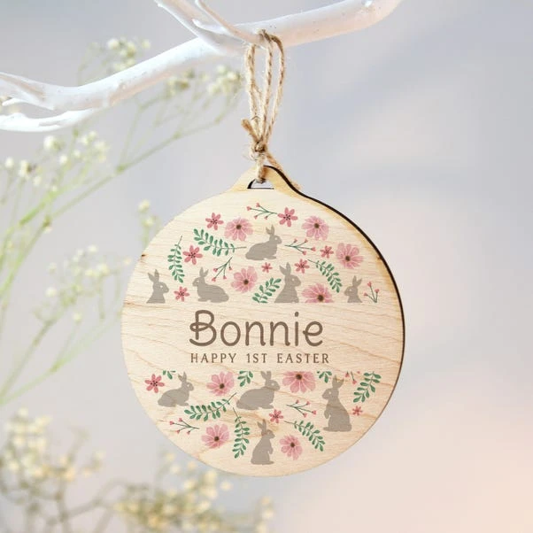 This Personalised Floral Easter Wooden Hanging Decoration is perfect for Easter morning ambiance. Personalise it with up to 12 characters on Line 1 and up to 25 characters on Line 2. Made from wood and complemented by ribbon, it adds a rustic charm to your Easter decor.