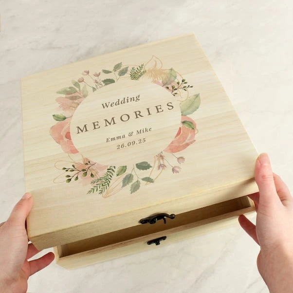 Personalised Floral Watercolour Wooden Keepsake Box: Store your precious memories in style with this personalised wooden keepsake box. With ample space for customisation, it’s the perfect place to store wedding souvenirs or treasured mementoes.