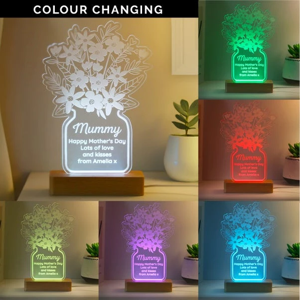 Please note that all personalisation is case sensitive and will appear as entered. The light is colour changing and can be changed using the control pad. The selectable colour options available are Red, Green, Blue, Pink, Yellow, Light Blue, White. These can be set to change constantly or have one specific colour.