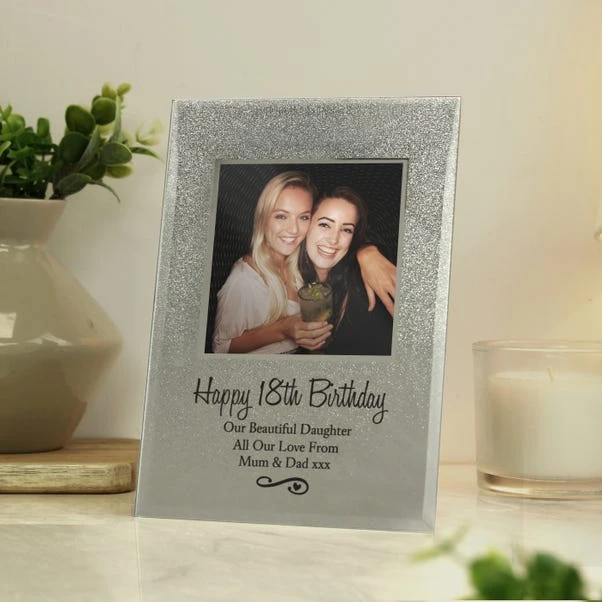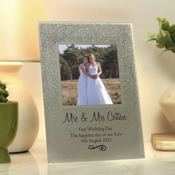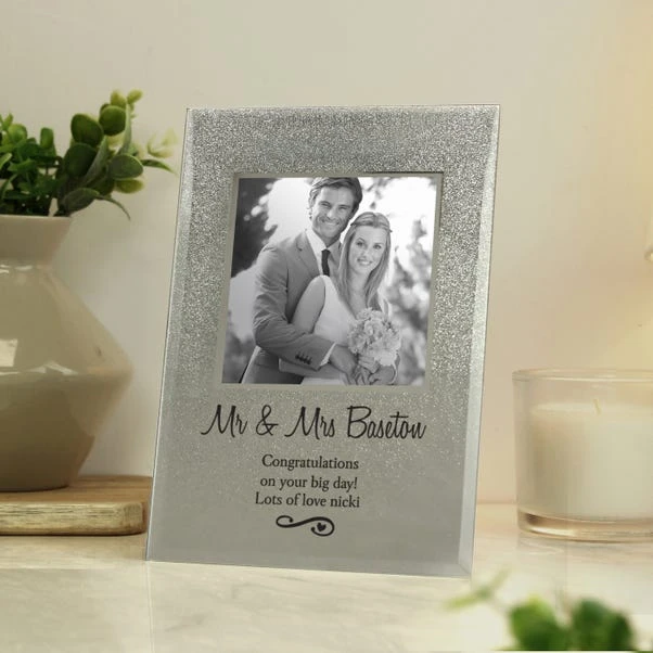 Sparkling with joy, this glitter glass photo frame is a delightful keepsake for cherished memories. Personalised with your message, it holds a 4×4 photo, making it a perfect gift for special occasions.