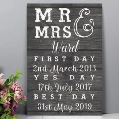 Honour the journey of love with this personalised Mr & Mrs metal sign. Engraved with significant dates and the couple’s surname, it’s a sentimental keepsake ideal for celebrating anniversaries, weddings, or Valentine’s Day, crafted from durable aluminium.
