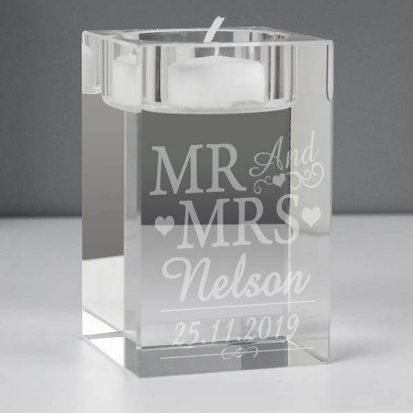 This Personalised Mr and Mrs Glass Tealight Holder: Add a romantic glow to their space with this elegant glass tea light holder. Personalised with their surname and date, and presented in a sleek black gift box, it’s a thoughtful gesture for any special occasion.