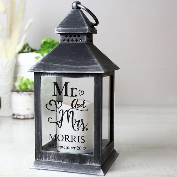 Personalised Mr and Mrs Rustic Black Lantern: Illuminate special moments with this personalised rustic black lantern. Engrave it with a surname and message, creating a memorable keepsake for weddings or anniversaries. The lantern features a warm orange flame effect and operates on three AAA batteries (not included).