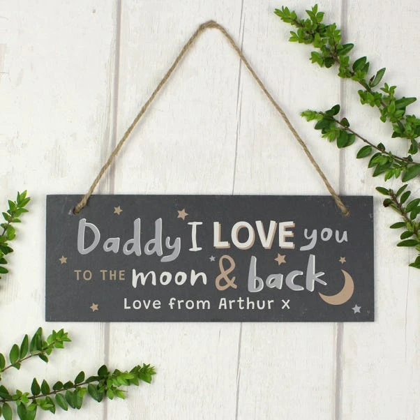 This Personalised To the Moon and Back Hanging Slate Plaque is a sweet reminder of your affection. Personalise it with a name and a short message, creating a charming display for any space. The natural slate and rustic string give it a delightful finish.